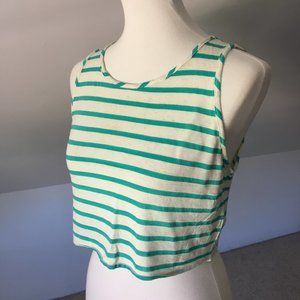 Teal and white horizontal striped crop top. Like new condition. No imperfections. Chest measures 17" flat across. Armhole down is 7". Total length 15" long. Crew style neckline. Not sheer or see through. Meant to have a looser more relaxed fit. Machine washable! Modeled photos in collage listing for "So Many Skirts." Skirt is no longer available for sale. Happy to answer any questions you may have!