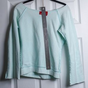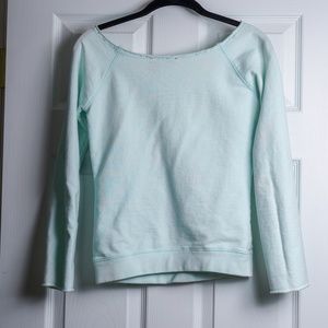 Cute light teal / turquoise sweater with a wide, rough trimmed shoulder than can be worn off shoulder or one shoulder, that has a boho, beachy vibe!