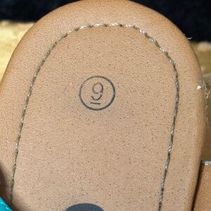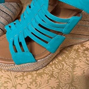 Gently used teal and tan wedge platform heels from the now closed Deb. The platform featured a textured feel and wicker pattern.