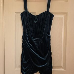 Emerald green velvet mini dress with a sweetheart neckline and corset-style top. Ruched details