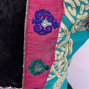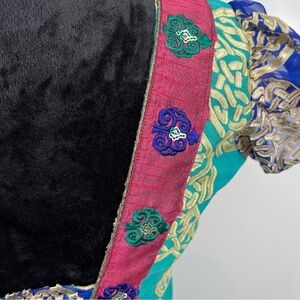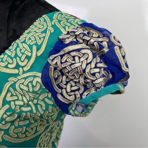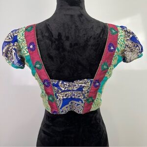 This elegant teal, blue, pink, and gold top features intricate embellishments. Built in padded cups. Hook and latch closure. Handmade. Good used condition.
