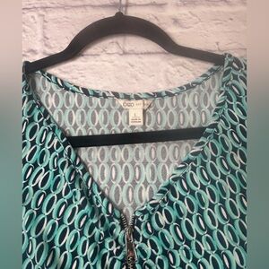 Chic sleeveless blouse with a teal and navy pattern. Features a stylish zipper detail. Ideal for versatile styling like layering with a cardigan or jacket!
