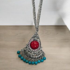 Teal and Red Moon Howlite Aztec Pendant with Rhinestones Necklace 22in