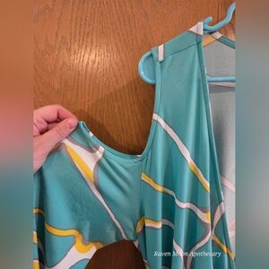 Stylish wrap dress with abstract teal and yellow pattern. Features a unique cold shoulder design.