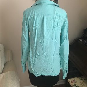 This is a teal button down shirt in a size medium. It's in great condition except for being wrinkled. Very comfy and soft.