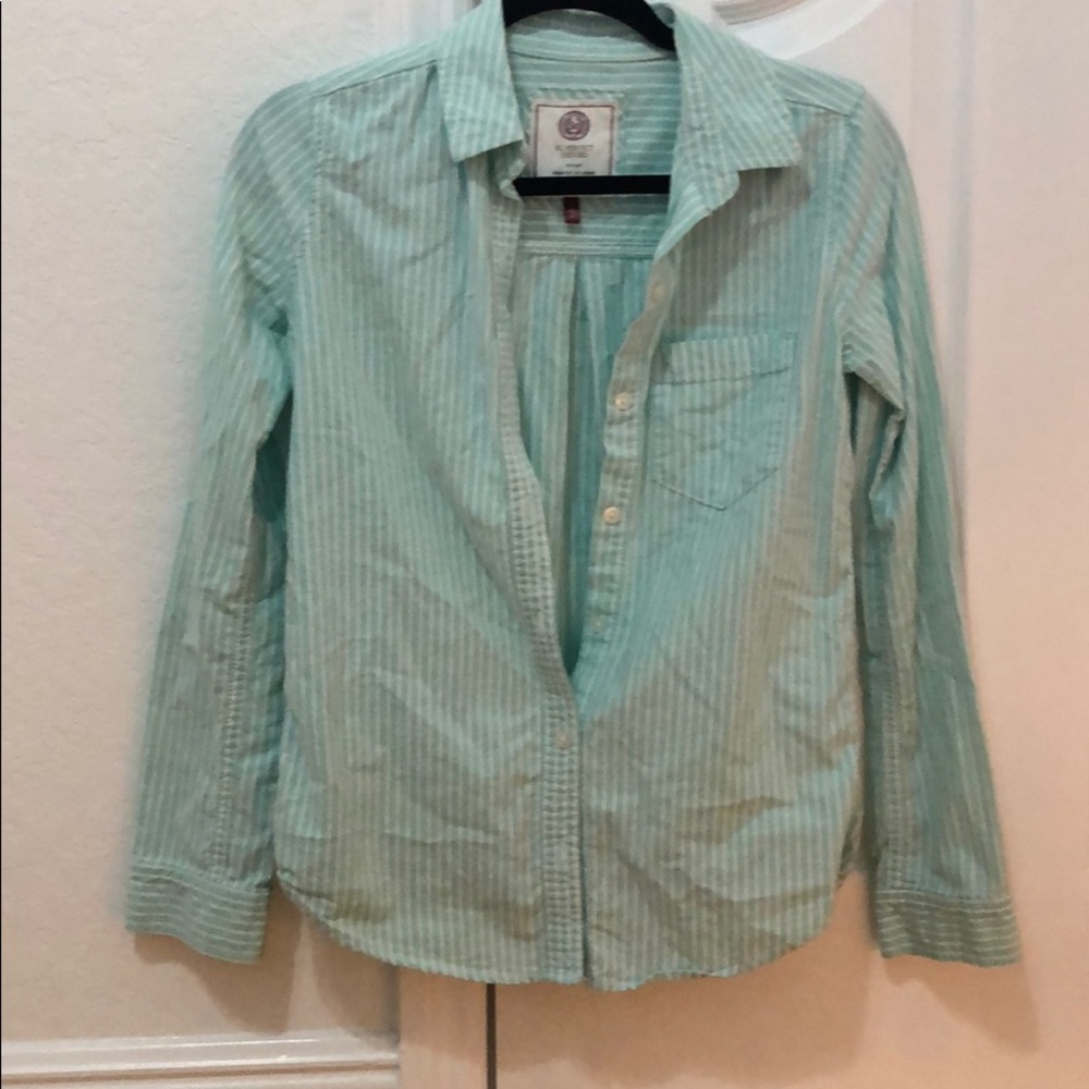 Teal button up shirt with vertical white stripes