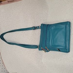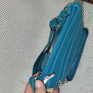 New with tags. Top zipper opening and 4 zipper pocket on outside. Front zipper pocket for credit cards and I. D. Back open pocket for phone. Lined inside. Size: 9" x 8". Adjustable strap: 29" to 52".