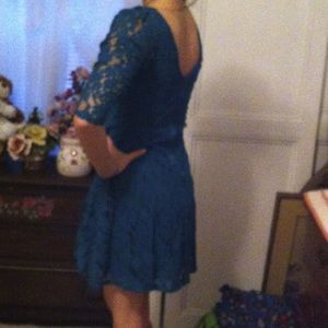 Teal, lace overlay, zipper in the back- I have the same dress in small and I absolutely love it! This one has never been worn, the photos of the model show her wearing a small- it looks shapeless on the hanger but once you put it on it makes your waist look amazing! Accentuates all the right things. Tags still on.