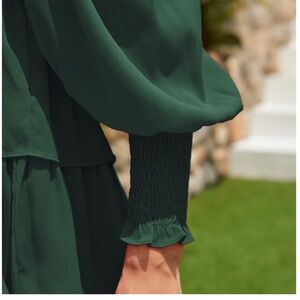 Teal long-sleeve smocked square neck tiered mini dress.