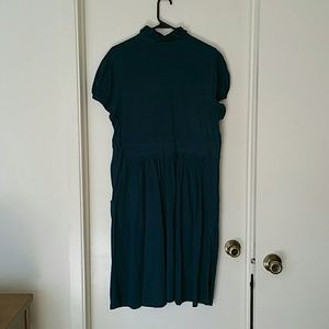 This is a beautiful teal ruffle dress. It is hard to capture the color! Super comfy and with pockets, it can easily be worn to work.