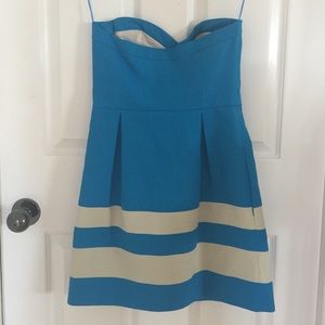 Vibrant teal blue strapless dress. Zara brand. Made in Morocco. Polyester lining. Dress is made of 97% cotton. Only worn once. Pristine condition.