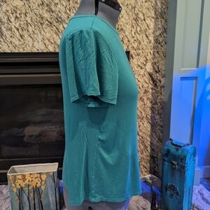 Simple and timeless teal short sleeve tee. Front neckline and chest area is sheer.