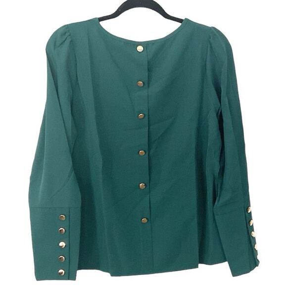 Teal long sleeved blouse with rose gold buttons on front and sleeves. Size M 20” X 23”