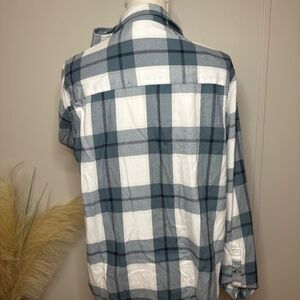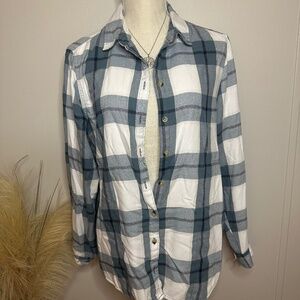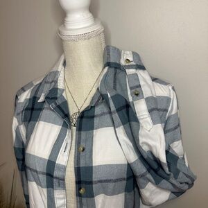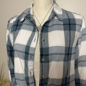 Plaid, teal, white, and black pocketed long sleeve. Light weight, nice fabric!