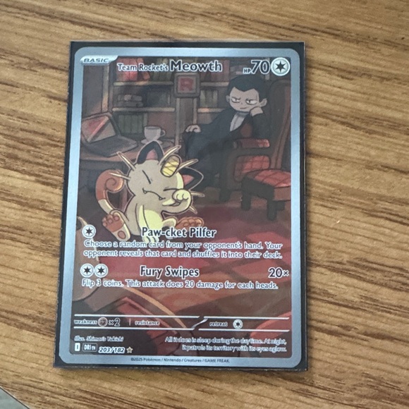 Discover the classic Team Rocket's Meowth card. Features a striking black and gray design. Perfect for collectors and fans alike.
