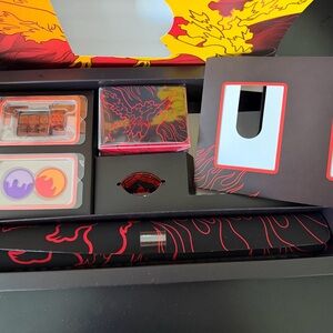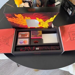 Team Rocket's Moltres GX Ultra Premium Collection Box. No cards. Includes 1 playmat for dueling needs, 1 deck box, 1 metallic coin, 6 damage-counter dice with 1 competition-legal coin-flip die, and 2 condition markers