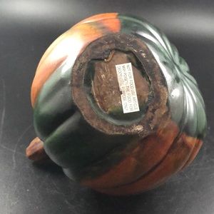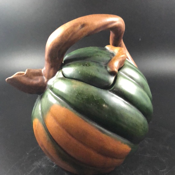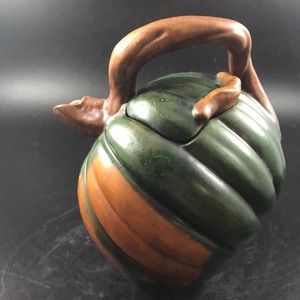 Gorgeous pumpkin shaped teapot with curved handle which also makes the spout. Deep beautiful colors of green and brown with places of dark tan. Lid on the inside slightly chipped. Came that way from the manufacture. Tips slightly up naturally