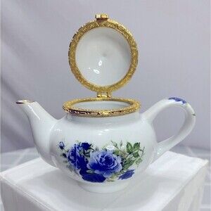Porcelain Teapot Blue Rose Floral Pattern Gold Trim 1960’s Trinket Box Formalities by Baum Bros