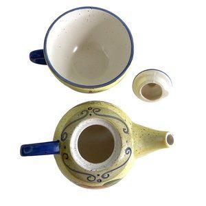 Single serve teapot and cup set. The teapot sits on top of the cup for storage or to keep the beverage hot. The oversized cup stands 3" tall x 4.5" wide. The pot measures 4" tall (with lid) and 4.5" wide. The design is hand painted fruit on a speckled yellow background.