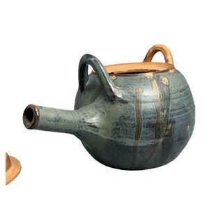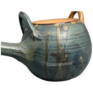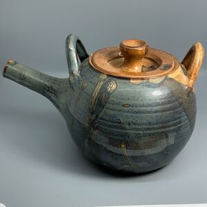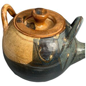 Teapot Pottery Stoneware Artisan Made Glazed Blue Beige Tan Orange Signed Diana