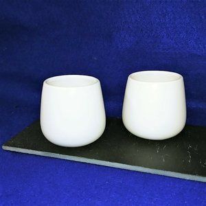 A Red Envelope teapot set featuring a vintage 1950s design with Asian styling. The set includes two small cups, a ceramic teapot with a wood handle, and a slate serving tray. All pieces are white with brown accents.
