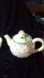 very sweet yet totally functional teapot good size the matching bowl can be used for display or treats not sure it was intended as I displayed just looked cute when listing the roses are raised over a trellis type pattern wonderful gift for tea collectors I do not see markings and could not find the same elsewhere so that means it unique. for all my second hand roses