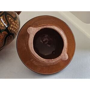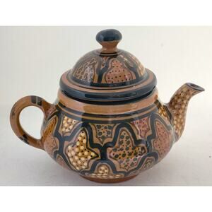 Teapot by Le Souk. This is a ceramic art pottery teapot made in Tunisia. It holds 3 cups of fluid. The top has notches to hold the top in place while pouring. This type of pottery is known for the unique hand painted designs. They resemble a mosaic type design. It is done in tones of browns and black. Unique teapot for any table or buffet.