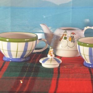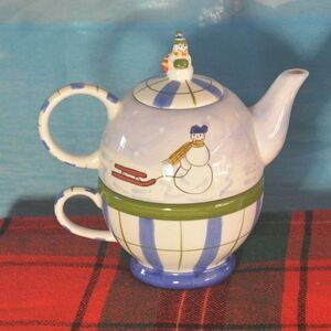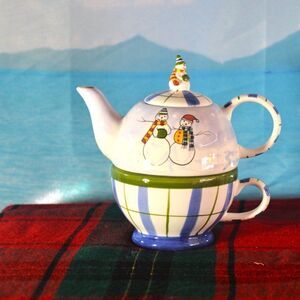 These adorable snowman teapots hold the teapot on top with the cup on the bottom. The lid even has a snowman on top. You could enjoy gifting one or two. Or you could share a cup with a special person when they come to visit. These are unusual yet practical. These are new without tags.