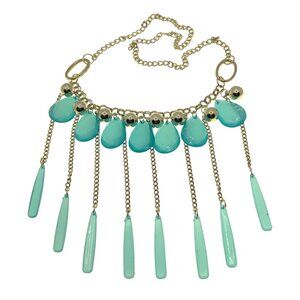 Teardrop Beaded Chain Fringe Necklace 24 Inch Length Blue Silver Tone