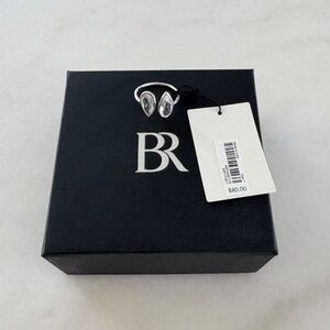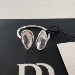 Two beautifully sparkling faceted teardrop stones are hand-carved from natural rock crystal. The stones are surrounded with sterling silver and set in inverse directions on an open-front sterling silver band.