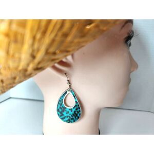 Teardrop Mother of Pearl Earrings Blue Leopard Print Dangle Hook 2.25” Boho Chic