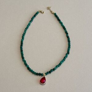 This stunning necklace features vibrant green beads and a striking red teardrop pendant, perfect for adding a pop of color to any outfit.