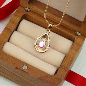 "Teardrop Pendant with White Rainbow Stone and Gold Frame Design, XPPT1686