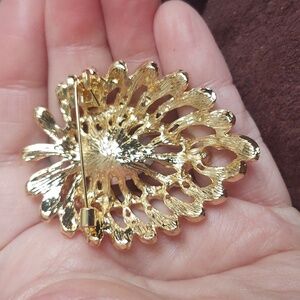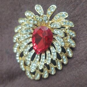 This stunning brooch features a vibrant red teardrop rhinestone set in a luxurious golden design surrounded by sparkling accents, perfect for adding a touch of elegance to any outfit.