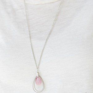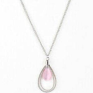Studded silver teardrops swing from the bottom of a shimmery silver chain. A glowing pink moonstone attaches to the innermost frame, creating a whimsical pendant. Features an adjustable clasp closure.