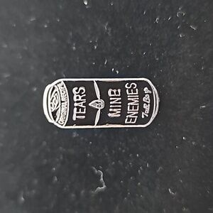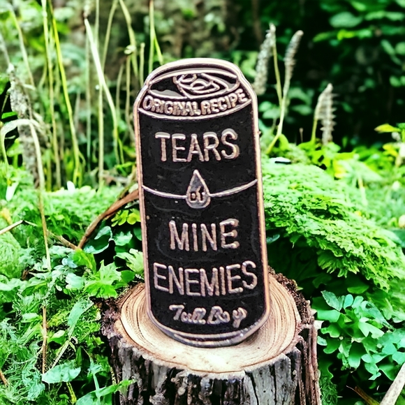 Enamel Pin Can that reads " Tears of mine enemies" "original recipe" and "tall boy"