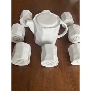 Teavana 32oz White Potter's Mark Ceramic Teapot Set w/ 8 Tea Cups / Infuser. Excellent Preowned condition. Minimal wear