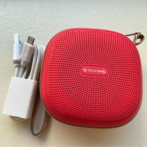 Take your tunes along wherever you go with this portable speaker by Tech Candy. Wireless, Bluetooth-enabled design features an attached wrist strap and a splash-proof build for dramatic walks in the rain or dance parties in the shower. Rechargeable.