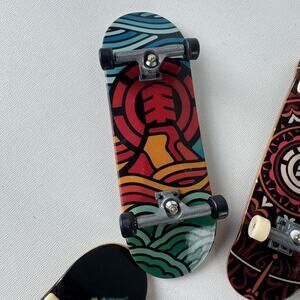 Includes 12 fingerboards with assorted deck designs and brands including Element, Almost, Plan B, Flip, and more unique art graphics.