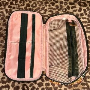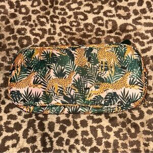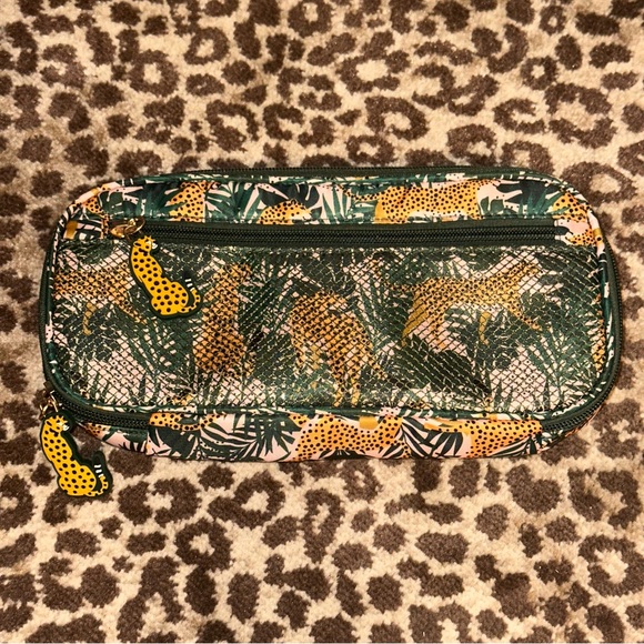 Stylish pouch with green and yellow animal print. Features a zip closure and vibrant design.