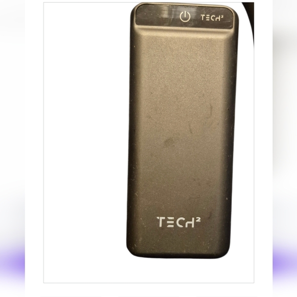Sleek silver power bank by Tech². Compact and efficient for on-the-go charging.