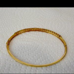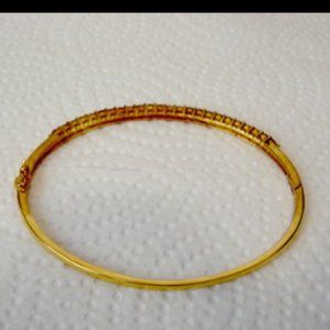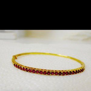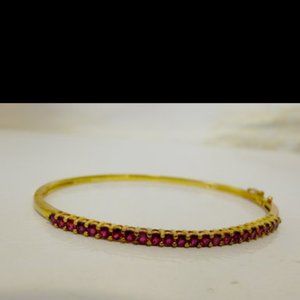 Technibond Genuine Red Garnet Bangle Bracelet Size 7-1/.2. Design Information: Bracelet features a single row of genuine Red Garnet gemstones across bangle. Measurements; Approx. 8"L x 1/8"W; Approx, 3-1/4" across. fits 6-3/4" to 7-1/2"Metal Type: Yellow Technibond; Plating: 14k yellow gold; Finish: Polished; Finding: Box clasp with single safety catch. Total Carst Weight: 1.5ct, mined in India.