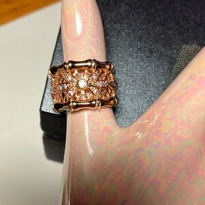 A Technibond Orginial make with 18K gold plating over 925 sterling silver featuring a rose gold filagree look with a bamboo design with a flower design in middle surrounded by CZs very pretty. Ring width is 1/2”