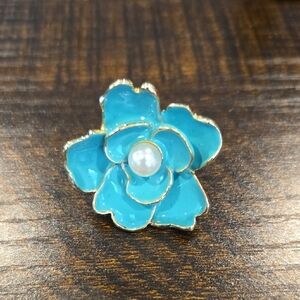 Charming Technibond brooch with a turquoise flower design. Features a central pearl accent. Ideal for enhancing any ensemble.