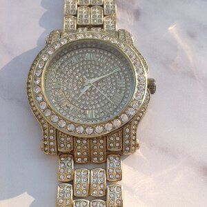 Gold, gold, gold, crystal, crystal, crystal, BLING The face, bezel and band of this watch are pave, that is, covered in crystals on a gold ground. This chunky watch screams bling. The brightness, of course, depends on the light in the environment or room occupied by its wearer. But whichever, the subject here is a festive bling out loud. The watch has gold Roman Numerals and hands 80s excess in the house. . Made by Techno Pave, it is in excellent condition. With a full length of 7", it is best suited as it is, for a woman or a man with a smaller wrist. Its either shocking or brilliant. I've of two minds on it, but certain that it is breezy and spectacular.