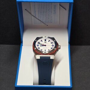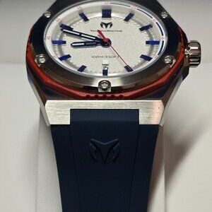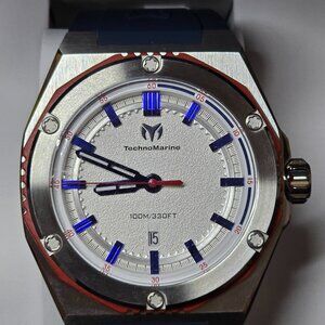 The TechnoMarine Coral Legacy Men's Watch is a luxurious timepiece with a stylish design suitable for formal occasions. Made with durable stainless steel and water-resistant up to 100 meters, this quartz movement watch features a blue silicone band, silver dial, and a steel bezel. With a 45mm case size and an analog display, this watch is both practical and elegant. It comes in its original packaging and is manufactured in Japan, making it a high-quality and fashionable accessory for any man's collection.