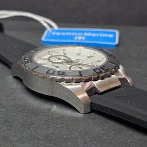 The Technomarine Men's Watch TM-725004 features a sleek silver dial with a black strap, making it a stylish and versatile accessory for men. Constructed with stainless steel and water-resistant up to 100 meters, this watch offers durability and functionality. With a chronograph feature, rotating bezel, and quartz movement, this wristwatch provides both practicality and precision. The round case shape and analog display add to its classic design, perfect for everyday wear or special occasions.