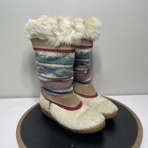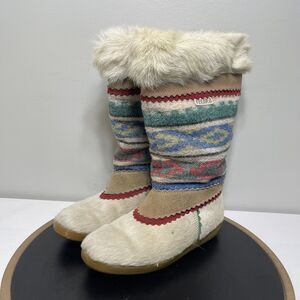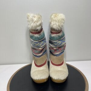 Crafted with genuine goat hair fur, soft suede trim, and a colorful knit wool upper, they deliver both warmth and standout vintage character. The plush fur lining extends through the shaft for added insulation, making them ideal for cold-weather wear. A durable rubber sole ensures grip and stability on winter surfaces, while the retro patterning and decorative details add a distinct European ski-inspired flair.
