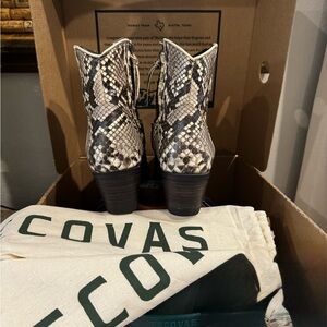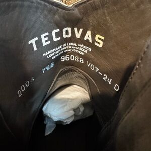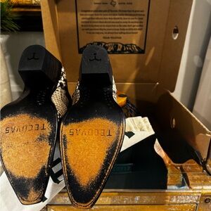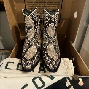 7.5 Tecovas Daisy black/bone Python booties. Beautiful and well taken care of, properly conditioned. Scales are intact and flawless. Boots worn three times, just a tad too big for me. Comes with original box and boot bags.