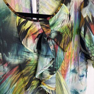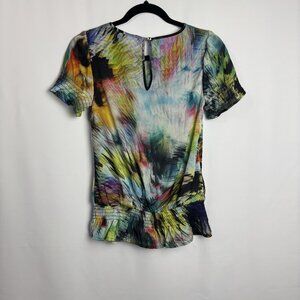 This is a Ted Baker blouse in size 0, or small/xsmall. This blouse is a thin and sort of sheer complexion, with a keyhole in the back secured with a button and a small loop attached. This blouse has a smocked portion on each sleeve, creating an excellent and chic puff sleeve appearance, and a smocked waist with some wiggly fabric after each smocked portion, making it flowy and stylish! The front of the blouse is decorated beautifully with a ruffled portion at the front, beginning with a stylish stitched bow at the top, and running down diagonally with elegance. This blouse has an abstract sort of pattern as it's exterior design, introducing a thoughtfulness to the blouse, and adding allure and depth. This blouse is in excellent condition! Small hole in brand tag from store tagging.